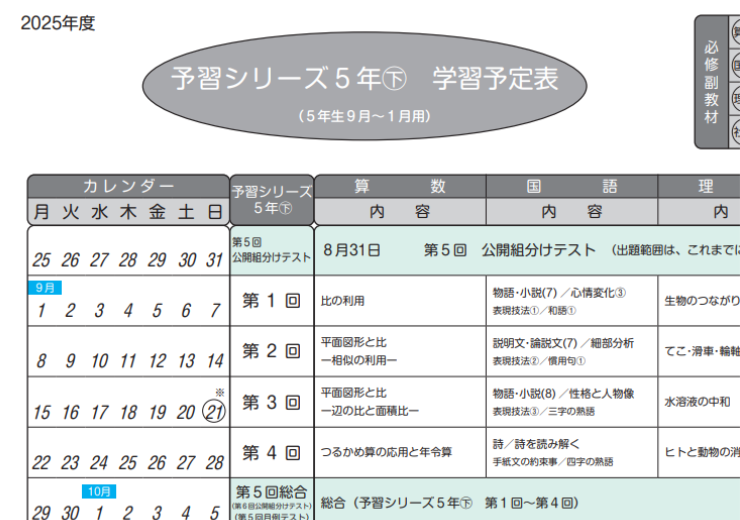 予習シリーズは、1週間に1章ずつ進むし、4教科もあるので毎日のスケジュール管理が大事です。