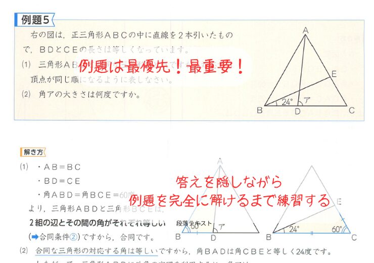 難しい例題もありますが、例題を解けないのに焦って練習問題に進んでも、テストで得点できません。